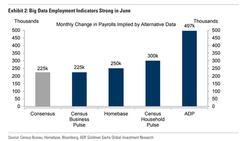 - Grandes datos. Las medidas alternativas de crecimiento del empleo indican fuertes ganancias de empleo en junio, con un ritmo medio de +275k en cuatro indicadores que sigue Goldman. ADP fue particularmente fuerte (+497k); sin embargo, los economistas de GS otorgan menos peso de lo habitual a esta medida debido a una posible distorsión en los factores estacionales de ADP: el crecimiento del empleo de ADP se recuperó en junio en 6 de los últimos 7 años, y en 193k en promedio excluyendo 2020.