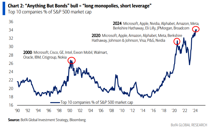 Bull ABB = “apostar por monopolios, vender en corto el apalancamiento” en acciones; las 10 principales acciones de EE. UU. = récord del 34% de la capitalización de mercado del S&P 500 (Gráfico 2 – “Los Magníficos 7” = 30%), las 10 principales acciones globales = récord del 23% del MSCI ACWI (2841 constituyentes); el liderazgo estrecho de las mega-capitales de “crecimiento” se mantiene intacto hasta que los rendimientos reales a 10 años de 2½-3% y/o rendimientos más altos se combinen con mayores diferencias de crédito para amenazar recesión.