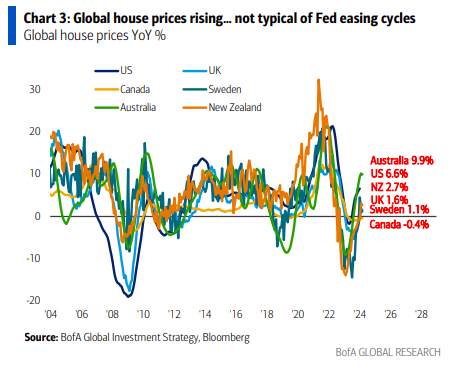 No es algo que normalmente veas cuando la Fed comienza a reducir las tasas… los precios globales de las viviendas aumentan (Gráfico 3),