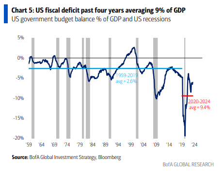 Era de los 2020s de gran intervención gubernamental (pandemia = “cheques de estímulo”, guerra = “rebajas de energía”, corrida bancaria = “depósitos asegurados”, vivienda inasequible = “perdón de deuda estudiantil”… los mayores déficits jamás registrados fuera de recesión – Gráficos 5-6); exceso fiscal…