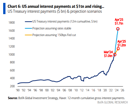 si gastaras $100 cada segundo de cada día, te tomaría 1966 años igualar los $6.2 billones que el gobierno de EE. UU. ha gastado en los últimos 12 meses; exceso fiscal = no aterrizaje = inflación = secular bear in bonds = ABB “Anything But Bonds” bull “Cualquier cosa menos bonos”…