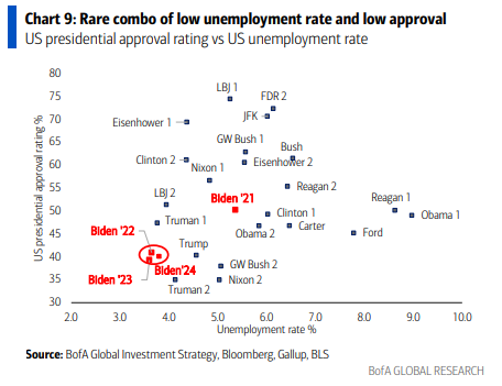 nota que la inflación de los ’70 terminó cuando los electorados votaron por candidatos que prometían revertir la inflación (nota hoy que claramente la inflación es la razón macro por la cual los índices de aprobación de Biden están <40% en un momento de tasa de desempleo <4% – Gráfico 9).