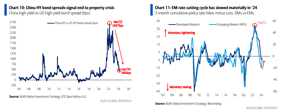 Las acciones chinas se disparan por la valoración, posicionamiento (el mundo “apuesta por los mercados emergentes excepto China, vende en corto China”), los diferenciales de bonos de alto rendimiento de China señalan que no hay crisis inmobiliaria (Gráfico 10); además… mayores rendimientos de UST + un dólar estadounidense más fuerte = problemas en mercados emergentes… el ritmo de recortes de tasas por bancos centrales de EM es más lento (Gráfico 11 – algunos revierten a aumentos debido a la inflación y la debilidad de FX, por ejemplo, Indonesia); China es uno de los mercados de bonos con mejor desempeño en lo que va del año… China menos vulnerable a la crisis de EM suponiendo que no haya colapso del yen japonés.
