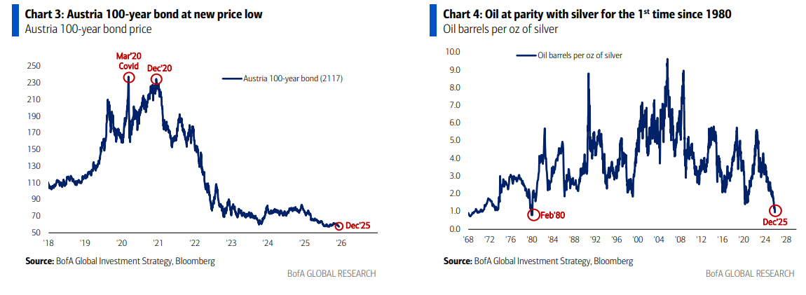 El precio tiene razón: bono austriaco a 100 años en nuevo mínimo de precio (-76% desde el máximo de marzo de 2020 – Gráfico 3). Continúa el mercado bajista global de bonos en los años 2020; pero Trump quiere boom sin subida de las tires de los bonos (recorte del impuesto de sociedades, reactivación del oro, stablecoin, energía, farmacéuticas, inflación vía precios), salto de productividad = boom y menores rendimientos; de lo contrario, círculo vicioso provocado por un dólar estadounidense mucho más débil… ¿por qué priorizar la paridad de la plata frente al petróleo por primera vez desde 1980? – Gráfico 4.