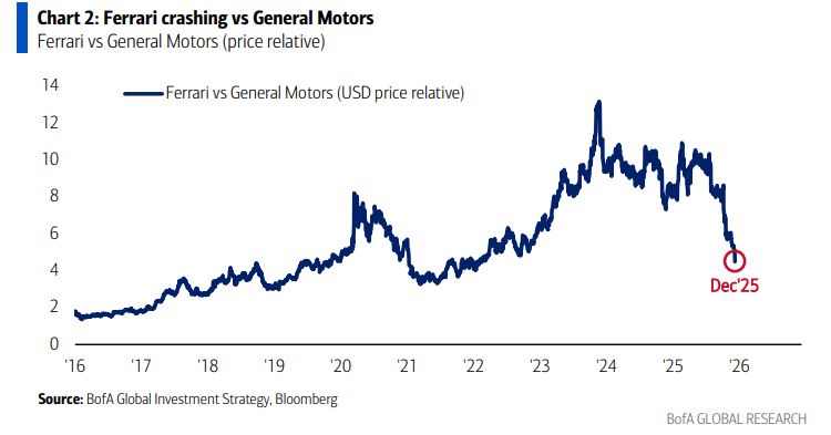 El gran panorama: caída acusada del sector minorista en General Motors (Gráfico 2); consumo con forma de “K” (rotación “ricos vs pobres” ya en marcha en 2025, pero los mercados lo dan por descontado); “huida hacia la calidad” en 2026 vía rotación “Main St” (MDY MidCap, IYR SmallCap, IWC Microcap) desde “Wall St” (mega capitalización MGC – Gráfico 5).