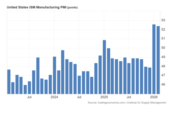 El PMI manufacturero del ISM descendió hasta 52,4 en febrero de 2026 desde 52,6 en enero, aunque se mantuvo por encima de las expectativas del mercado (51,8). La lectura señaló un segundo mes consecutivo de expansión en el sector manufacturero, aunque a un ritmo ligeramente más moderado.