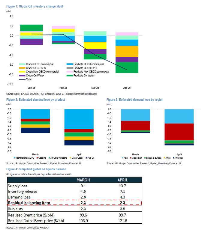 Lo llamativo es que estas pérdidas se han producido con precios que no parecen extremos en términos históricos. Los futuros del Brent realizados promediaron algo menos de 100$/barril en marzo y también en lo que va de abril, mientras que el crudo físico promedió 107$ en marzo y 123$ en abril hasta la fecha. Es cierto que los precios de los productos refinados casi se han duplicado desde niveles previos a la guerra. Aun así, los precios por sí solos no parecen lo suficientemente altos como para explicar una caída de la demanda de esta magnitud ni con esta rapidez. Esto sugiere que gran parte de la caída no es una “destrucción de demanda” tradicional impulsada por precios, sino una pérdida de demanda forzada por la falta de oferta. Dicho de otro modo, la escasez física está limitando el consumo real, por lo que lo que parece destrucción de demanda es en realidad una caída de oferta reflejada en el lado de la demanda.