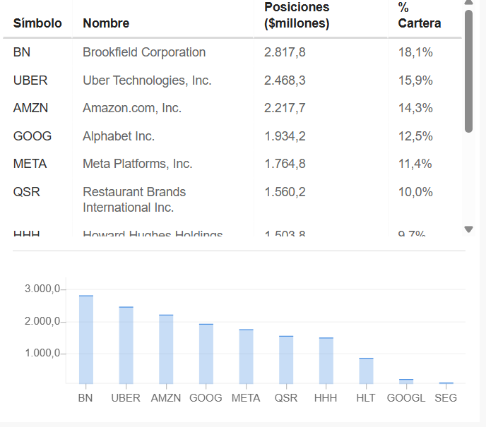 Bill Ackman aprovechó el 4T para cargar META, Brookfiel (BN) y Amazon. Vendió algo de Google y de Uber. Sus mayores posiciones siguen siendo BN, Uber y AMZN, GOOG y META.