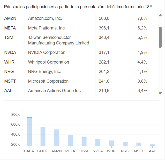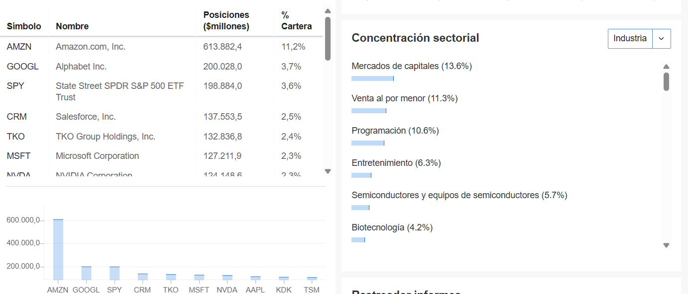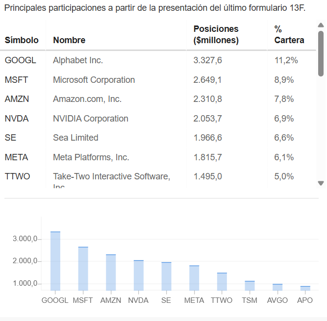 Vendió algo de MSFT, APP y TSM… No compró nada de sus principales posiciones, NOW, CPNG y NFLX. Cartera muy poderada en tecnología, con GOOG, MSFT, AMZN, NVDA y SE representando un 40%: