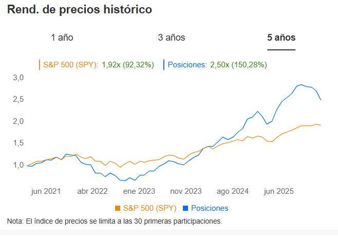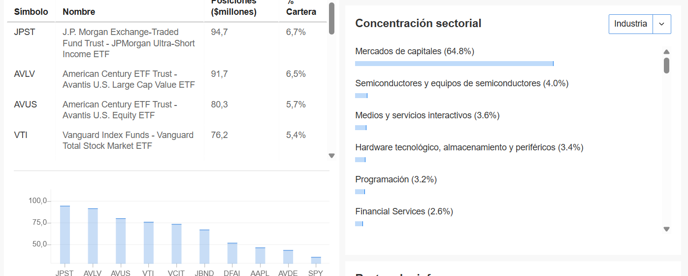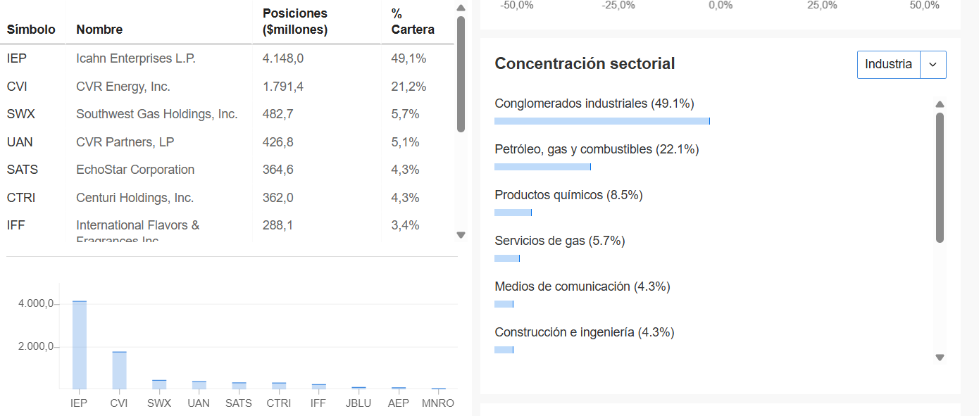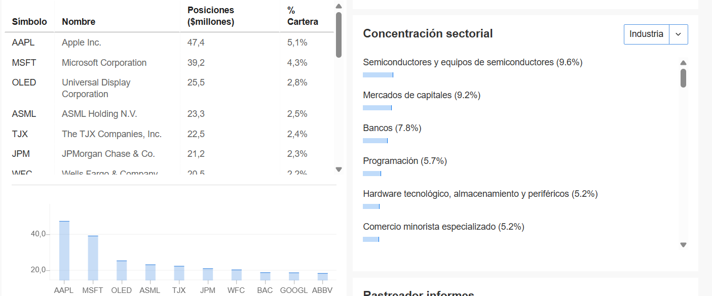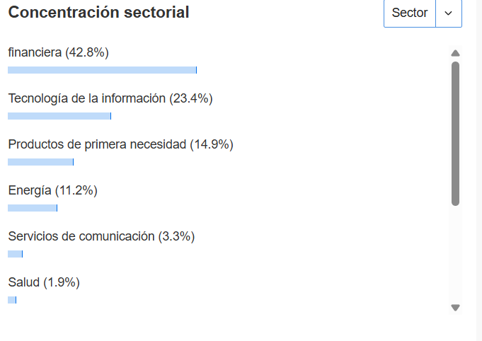 Sigue muy ponderado en el sector financiero, la energía va ganando terreno. Posee 42 activos en cartera.
