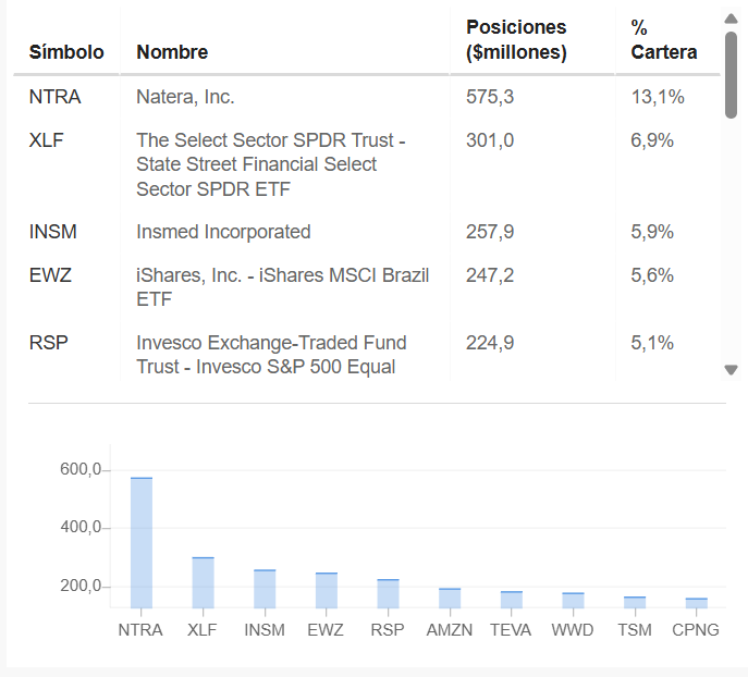 Otro inversor que está apostando por el sector financiero es Druckenmiller: Su mayor compra del 4T fue el XLF y también añadió un ETF de Brasil (EWZ) y el S&P500 equiponderado (RSP). La bioteconología es su mayor sector, con Natera liderando la cartera.