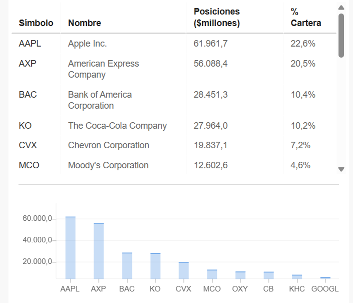 El último trimestre de Buffett liderando Berkshire Hathaway vendió Apple, BofA y la totalidad de Amazon (ocupaba solo el 0.2% de su cartera). Compró más Chevron (CVX) y Chubb Limited (CB). Sus mayores posiciones son Apple, American Express y BofA.
