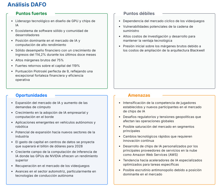 La compañía se ha consolidado como líder en centros de datos, IA y networking, con márgenes brutos superiores al 70% y una posición dominante en software, gracias a su ecosistema CUDA y plataformas como Omniverse.