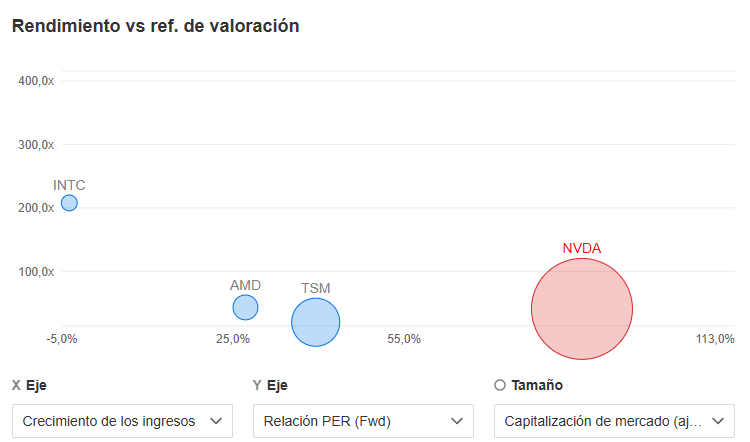 - Intel: Prácticamente estancada (+0,2% en ingresos trimestrales, BPA negativo), con un ROE de -18,3% y retrasos tecnológicos que la mantienen rezagada en la ola de IA. Su P/E forward de 207,8x refleja debilidad estructural más que expectativas de mejora.