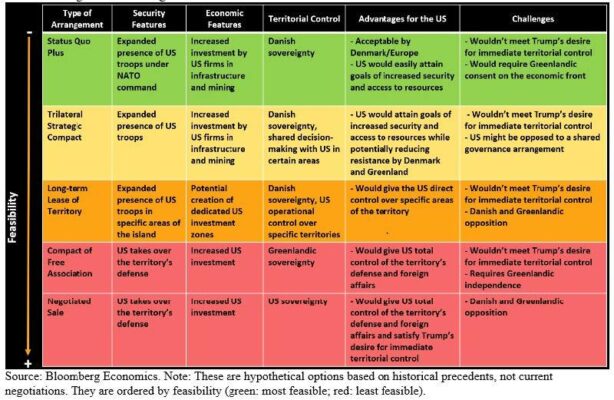 El resultado más probable es un ACUERDO NEGOCIADO que amplíe la presencia de seguridad y económica de EE. UU. en el territorio y atienda los objetivos declarados por EE. UU. —una postura de seguridad más fuerte en el Ártico, una mejora de la alerta temprana para defensa antimisiles y acceso a los recursos naturales de Groenlandia— mientras Dinamarca preserva la soberanía.