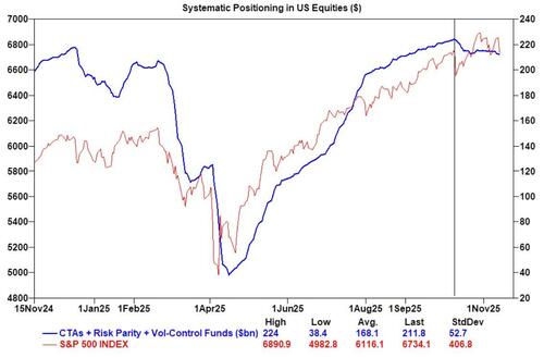 Coppersmith afirma que en las estrategias sistemáticas, el riesgo de cola izquierda sigue siendo significativo : el nivel de referencia a corto plazo del CTA para el SPX se sitúa en 6725, y el de medio plazo en torno a 6440. Las posiciones largas ya se han reducido desde principios de octubre (de 224.000 millones de dólares a 212.000 millones al inicio del viernes), y si bien los flujos a partir de este punto son pequeños, un movimiento bajista de 1 sigma podría provocar ventas globales de acciones por valor de hasta 165.000 millones de dólares. Dicho de otro modo: este grupo de posiciones conlleva un riesgo de cola izquierda considerable esta semana.