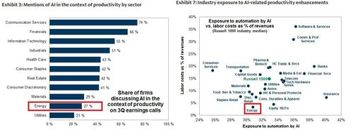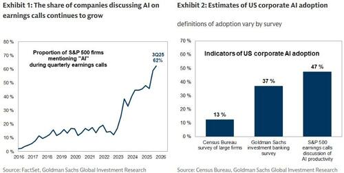 Al mismo tiempo, la adopción de IA corporativa sigue en aumento. Casi la mitad (47 %) de las empresas del S&P 500 abordaron la productividad de la IA en las conferencias telefónicas del tercer trimestre. Los casos de uso se centran en mejoras operativas reales (programación, atención al cliente, gestión de la cadena de suministro, recursos humanos) y algunas empresas ya han comenzado a cuantificar los resultados. NOW elevó su objetivo de margen operativo para todo el año en 50 puntos básicos gracias a las mejoras en la eficiencia de la IA, y CHRW aumentó su objetivo de ingresos operativos ajustados para 2026 en más de 100 millones de dólares gracias a las iniciativas de Lean AI.