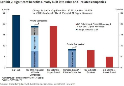 En el ámbito de la IA, la narrativa sigue cambiando. La cesta de acciones de IA del índice GS TMT (GSTMTAIP) ha caído aproximadamente un 8% en las últimas dos semanas, su mayor retroceso desde el primer trimestre, incluso cuando el S&P 500 se sitúa a menos del 2% de sus máximos. Según Peter Callahan, especialista en el sector TMT, el sentimiento y el posicionamiento han disminuido desde los extremos de 9,5/10 de principios de caída hasta situarse más cerca de 7,5-8/10. El análisis macroeconómico de GS Research ayuda a comprender la situación actual: una década de fuerte productividad impulsada por la IA se traduce en un aumento aproximado del 15% del PIB y de los beneficios, pero las empresas relacionadas con la IA ya han añadido entre 18 y 19 billones de dólares a su valor de mercado desde 2022, cerca del límite superior de lo que justifica este cálculo a largo plazo. La historia no está rota, pero las expectativas para la siguiente etapa son más altas, por lo que estos retrocesos tienen un mayor impacto ahora que en el primer trimestre.
