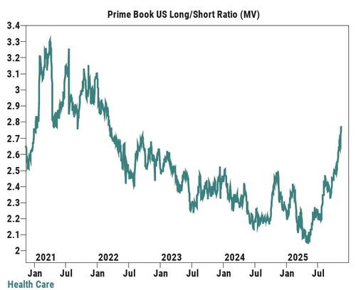 Nuestros flujos reforzaron la tendencia defensiva. El sector de la salud fue el sector estadounidense con mayor volumen de compras netas por segunda semana consecutiva, y los fondos de cobertura han acumulado compras en este sector durante nueve semanas seguidas, lo que ha impulsado la relación posiciones largas/cortas en el sector de la salud estadounidense a su nivel más alto en más de tres años. Los inversores se inclinan por la idea de que el sector de la salud representa la expresión de crecimiento defensivo más clara, en un contexto donde la confianza en la IA se ha enfriado notablemente y la incertidumbre macroeconómica se está ampliando.