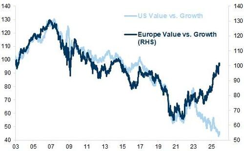 La dinámica de valor frente a crecimiento ha sido divergente entre Estados Unidos y Europa.
