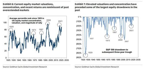 Y ahí es donde el estratega de Goldman se acerca más a advertir que podría estar a punto de producirse otra crisis del mercado, a saber: ” la actual combinación de valoraciones elevadas, concentración extrema y fuertes retornos recientes del mercado accionario estadounidense rima con un puñado de mercados accionarios sobreextendido durante el siglo pasado.
