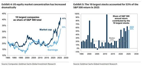 Sin duda, no todo será color de rosa: la combinación de una concentración extrema del mercado de valores y la evolución del mercado de IA impulsará microrrotaciones con posibles consecuencias macroeconómicas en 2026, advierte Snider. Continúa señalando que «las 10 acciones más grandes del S&P 500 representan el 41 % de la capitalización bursátil e impulsaron el 53 % de la rentabilidad del S&P 500 en 2025». Y si bien el estratega de GS prevé que el gasto en IA vuelva a superar las estimaciones de consenso este año, su crecimiento comenzará a desacelerarse a medida que aumenta la adopción corporativa, lo que provocará rotaciones entre las principales acciones tecnológicas estadounidenses que generan un riesgo bidireccional para el índice agregado.