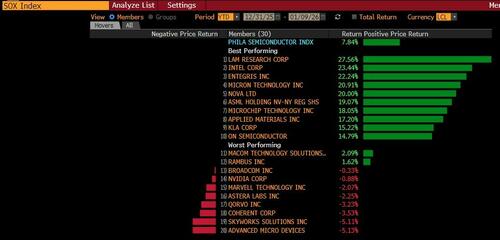 Uhhhhh … ¿Qué está pasando exactamente? … Semicap, memoria y analógica suben un 15-50% para empezar el año, frente a todas las empresas de informática que se mantuvieron estables o a la baja (AMD, NVDA, AVGO). A continuación, se muestra el gráfico de líderes/rezagados del año hasta la fecha…