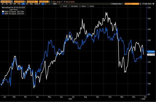 …ambos nombres muy actuales para comenzar el año, con el sentimiento de los inversores inclinándose (mucho) más alcista en DASH (los alcistas creen que esto puede volver a ser un compuesto de superar y subir después de informar a un año de inversiones en la última llamada de EPS) que en UBER (el sentimiento de HF se inclina decididamente cauteloso, en gran medida vinculado a la incertidumbre de los AV y un debate sobre la velocidad del margen en 2026)… en ese contexto, la verdad quizás (incómoda) es que UBER (azul) ha superado a DASH (blanco) durante el último año por 3 puntos – gráfico a continuación (y francamente, también han trazado trayectorias de acciones muy similares durante este período)… Entonces, ¿qué le depara 2026 al ‘par’?