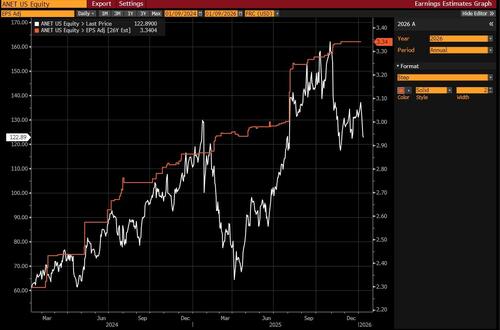 … las acciones bajan 4 días seguidos y vuelven a los niveles de principios de agosto… realmente no parece nada “nuevo” que señalar, solo los mismos debates de los inversores sobre la competencia/visibilidad (caja blanca), la trayectoria de los márgenes dada la combinación (CSP/caja azul), la valoración (se ha negociado en un rango de 25x-50x en los últimos años, en las constantes de NTM) y la magnitud del alza de las estimaciones (por ejemplo, cuán conservadora fue la guía de ingresos inicial del 20%+ para el año calendario 26)… el gráfico a continuación son las revisiones de EPS (naranja) frente al precio de las acciones (blanco)… ¡cuidado con la brecha!