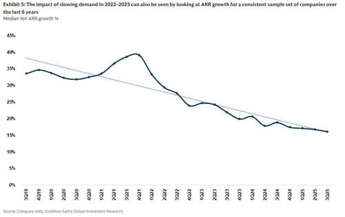 …si bien hubo cierto optimismo táctico a principios de año con respecto al potencial de reversión en algunos sectores del software [señal: Software subió un ~5% de lunes a miércoles de esta semana, su mejor racha de 3 días desde mayo de 2025]… esa tesis fue desafiada por un desvanecimiento a finales de la semana, emblemático de la baja confianza de los inversores en medio de debates tanto a corto plazo (guías del 4T / AC26) como a medio plazo (IA / codificación / competencia). De hecho, los servicios de TI / consultoría han superado al software en ~10+ puntos en los últimos 2 meses. No, no es un error tipográfico… a medida que nos adentramos en las ganancias, los inversores buscarán que la línea azul inferior (crecimiento de ARR de la industria) se estabilice, o incluso se doble más, como prueba de que la IA está más cerca de un valor neutral / positivo para el grupo (y no del viento en contra que el mercado está contemplando actualmente).