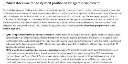 En relación con el punto anterior sobre los cíclicos, un área en la que estoy pensando más (y en la que estoy obteniendo más información) ha sido Pagos, especialmente nombres como V, MA, Adyen, KLAR, AFRM… mientras que gran parte del enfoque (y el rendimiento) del sector financiero GICS se ha centrado en los bancos… Los pagos son interesantes con el proceso de pensamiento siendo: puntos de entrada atractivos + mejor confianza del consumidor en el 1T (OBBB) + algunas historias temáticas (comercio agentic, etc.) + comparaciones más fáciles (debilidad del consumidor de gama baja en el 1T, aranceles durante el verano, cierre en el otoño)… haciendo doble clic aquí, Will/GIR publicó una buena nota la semana pasada sobre las perspectivas para 2026, incluyendo un fragmento a continuación sobre Comercio Agentic, que parece una posible historia de varios años en Tecnología.