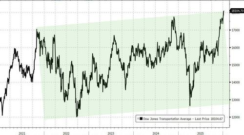 Los sectores de semirremolques, materiales e industriales están en alza este año en medio de un inicio de año procíclico . Un grupo que realmente ha destacado es el de transportes, que se encuentra en el extremo superior de un rango de varios años y ahora se acerca a otra posible ruptura. Históricamente, este es el segmento que suele liderar cuando el ciclo se estabiliza y comienza a subir de nuevo. (h/t L Coppersmith)