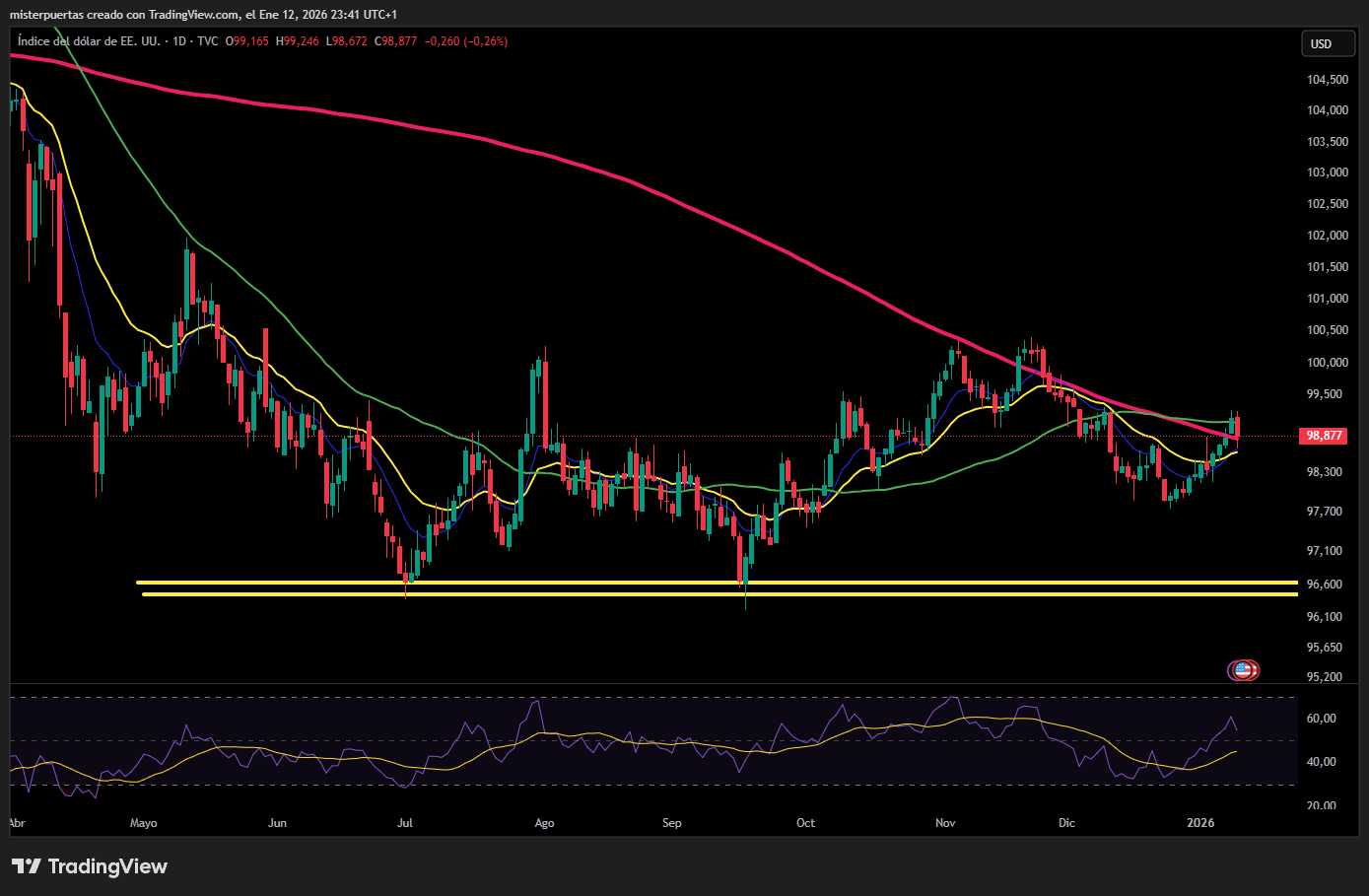 El dólar cayó durante la sesión en medio del cruce Powell–DoJ, aunque no logró recuperarse al ritmo de las acciones.
