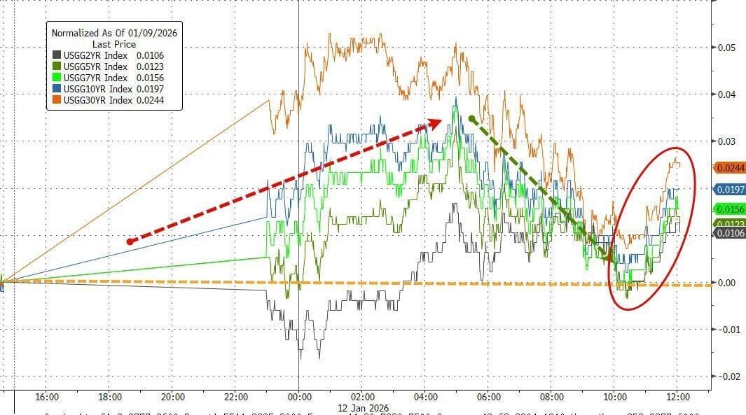 Los rendimientos terminaron al alza, pero muy lejos de los máximos de pánico iniciales del día, con subidas de solo 1–2 puntos básicos.