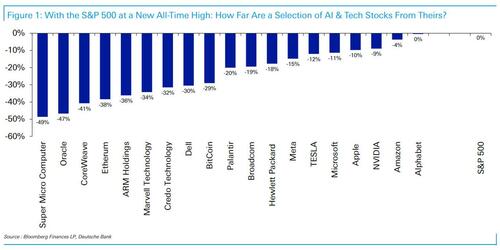 El CoTD de hoy, que se muestra a continuación, destaca una selección de empresas vinculadas a la tecnología y la IA (incluidas las criptomonedas) y su grado de declive respecto a sus máximos históricos, alcanzados el año pasado y muchos desde el verano. Algunas de las caídas son considerables dado el poco tiempo transcurrido, lo que hace aún más notable la resiliencia del índice.