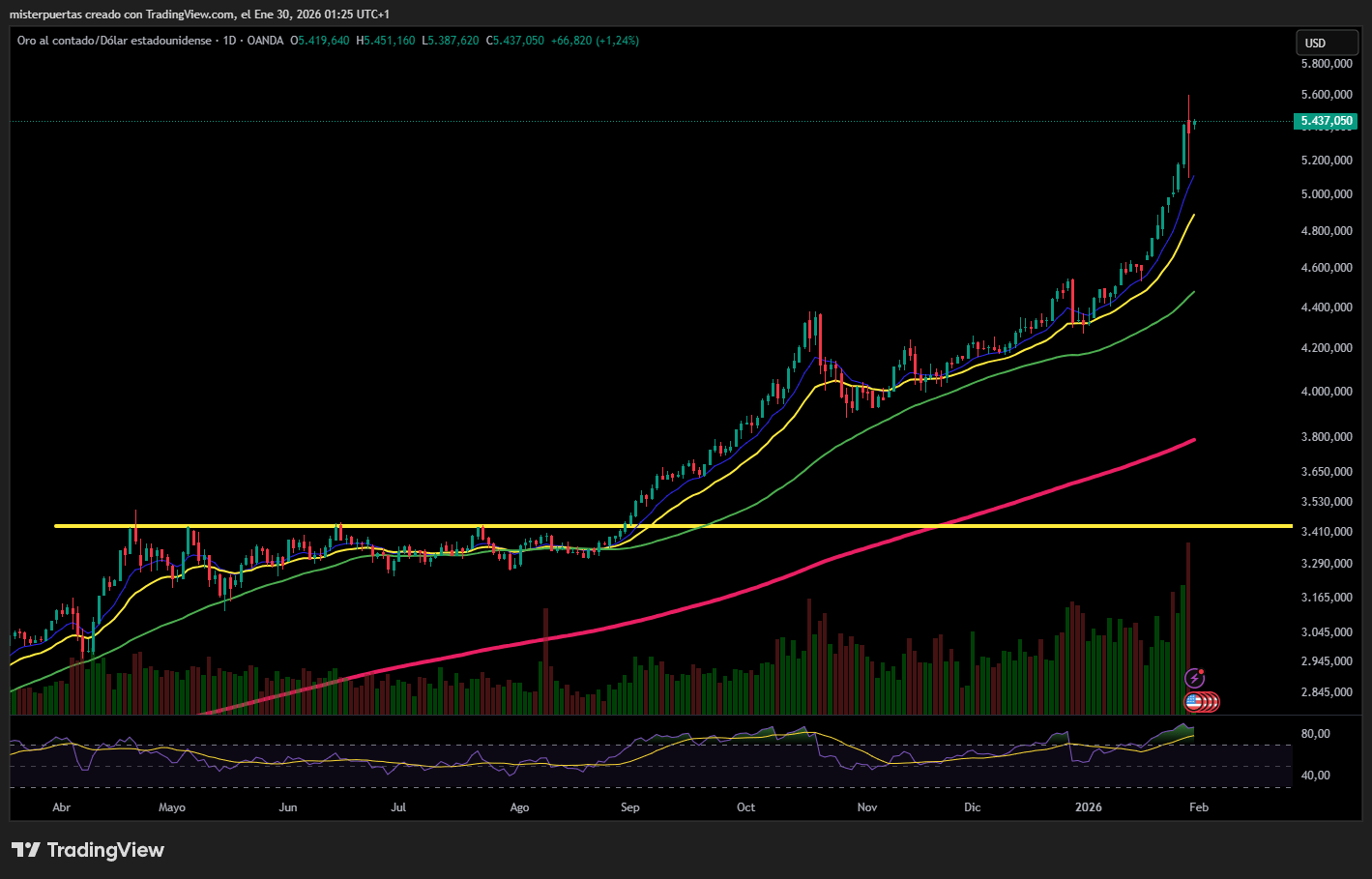 El oro llegó a situarse a pocos dólares de los 5.600 $, antes de desplomarse cerca de 500 $, en un movimiento extremadamente violento.