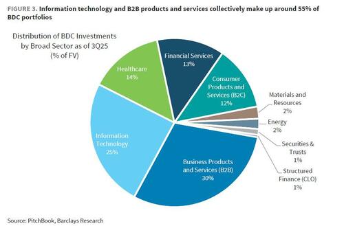 Barclays analizó la exposición sectorial en el universo BDC y descubrió que sus categorizaciones sectoriales generales muestran que las empresas tecnológicas y los productos comerciales constituyen la gran mayoría de las inversiones en BDC. En concreto, los productos y servicios empresariales representaban aproximadamente el 30 % de las carteras al tercer trimestre de 2025 (según su valor razonable), mientras que las tecnologías de la información representaban aproximadamente una cuarta parte.