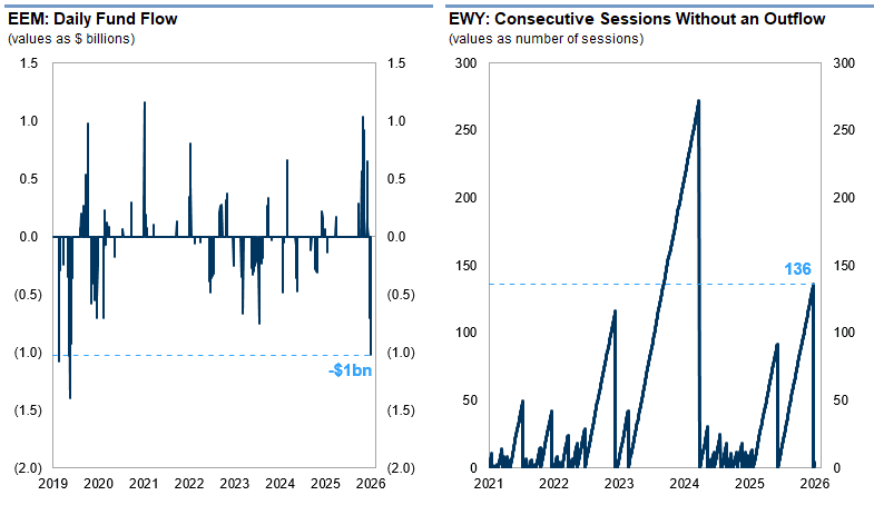 Mercados emergentes: Los ETF de renta variable de mercados emergentes tuvieron un comienzo récord en 2026, pero se ha producido una fuerte caída, impulsada por la evolución de los precios y la fortaleza del dólar estadounidense. EEM registró ayer su mayor salida diaria de capitales desde 2019 (-1.000 millones de dólares) y EWY experimentó su primer reembolso la semana pasada desde agosto de 2025.