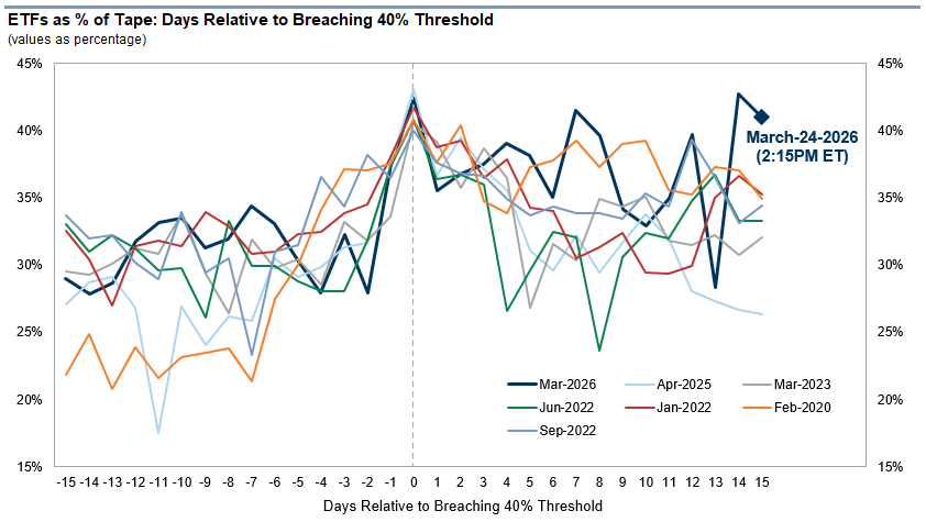 Al observar casos anteriores en los que los volúmenes de ETF han superado el 40% del total, sobre todo en febrero de 2020 y abril de 2025, el episodio actual ha sido sin duda uno de los más activos: