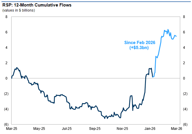 Ponderación equitativa: Goldman destaca parte de la fortaleza observada en el conjunto de fondos con ponderación equitativa. Se ha producido una fuerte rotación hacia el RSP (ETF del S&P con ponderación equitativa) a medida que la incertidumbre en el sector del software y el crédito privado repercute en el mercado… Desde principios de febrero, han entrado más de 5.000 millones de dólares en el RSP, y el fondo ha mantenido la mayor parte de estos activos (es decir, la situación no ha mejorado lo suficiente como para provocar una salida de capitales).