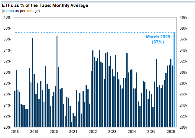 La mesa de operaciones de Goldman Sachs señaló que los volúmenes del mercado se mantienen bajos (un 3% menos que en las dos semanas anteriores), mientras que la actividad en ETF sigue elevada (actualmente representa el 37% del volumen de negociación).
