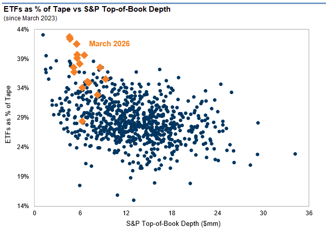 Liquidez : Mientras tanto, a medida que la liquidez en la parte superior del libro de órdenes de futuros disminuye, y prácticamente desaparece en acciones individuales donde incluso las órdenes más pequeñas generan movimientos significativos, se recurre cada vez más a los ETF como una forma de aumentar y reducir el riesgo macroeconómico. Sin embargo, Lucas advierte que, al operar en bloque, una menor liquidez en la parte superior del libro de órdenes (junto con una mayor volatilidad) puede generar mercados de riesgo más amplios, una dinámica importante que conviene tener en cuenta.