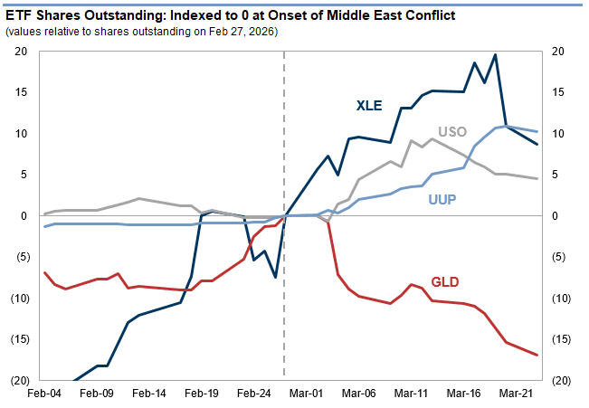 Respuesta de los flujos de inversión: Un puñado de productos macroeconómicos han experimentado entradas de capital en respuesta a las tensiones geopolíticas (XLE/Energía, USO/Petróleo, UUP/Dólar estadounidense), mientras que los ETF de oro han visto una gran reducción en su posicionamiento.
