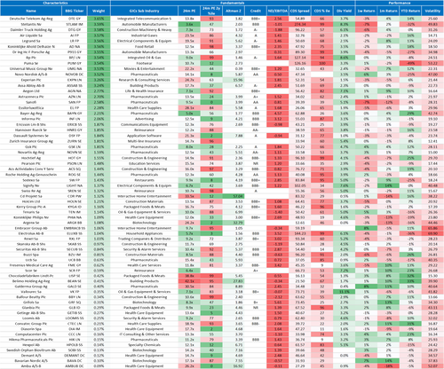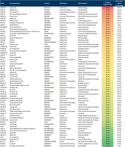 La cesta se construye con base en empresas con alta exposición de ventas a EE. UU. (aprox. 48 %), analizada mediante una superposición cualitativa para excluir empresas con alta participación accionaria en EE. UU. (p. ej., CRH, Qiagen); véase el apéndice para más detalles. La cesta está optimizada para liquidez y endeudamiento, y tiene una ponderación máxima de aprox. 4 %. GSXES899 puede operar hasta $740 millones al día al 20 % del valor diario anticipado.