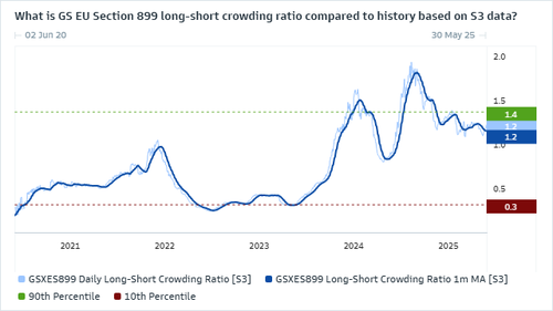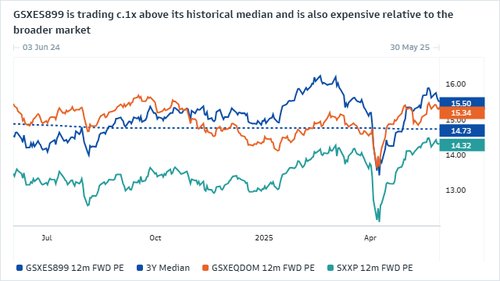 A pesar de ello, la valoración del índice GS EU Section 899 (GSXES899) se mantiene por encima de su valor histórico reciente. La cesta también es cara en comparación con el GSXEQDOM y el mercado en general (STOXX 600). Un retorno a su múltiplo medio a 3 años implica una caída de más del 5 % con respecto a los niveles actuales.