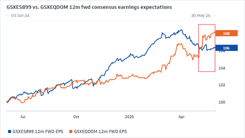 Si bien las expectativas de ganancias por consenso para GSXES899 habían superado a GSXEQDOM durante el último año , la tendencia ha cambiado desde principios de mayo.