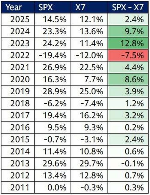 Finalmente, en 13 de los últimos 15 años, el SPX ha superado al Top 500 ex Mag 7 (índice X7) con una diferencia del 6% anual desde el 1 de enero de 2020.