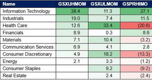 También observamos que la composición actual de Momentum es larga en tecnología de la información e industrias frente a corta en atención médica y consumo.