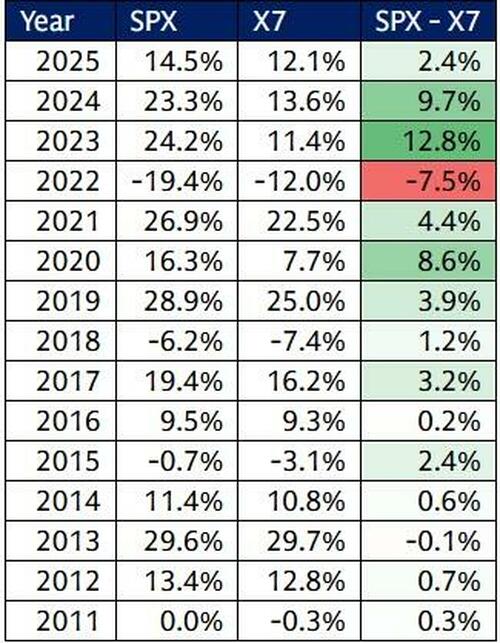 En 13 de los últimos 15 años, el SPX ha superado al Top 500 ex Mag 7 (índice X7) con una diferencia del 6% anual desde el 1 de enero de 2020 .