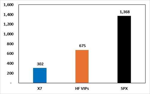 El uso del índice tradicional también introduce un sesgo de tamaño en la cartera dado que la capitalización de mercado promedio ponderada de SPX está fuertemente sesgada hacia los nombres principales, mientras que la capitalización de mercado promedio ponderada de X7 está más alineada con una cartera normal como lo representa nuestra HF VIP Basket (GSTHHVIP).